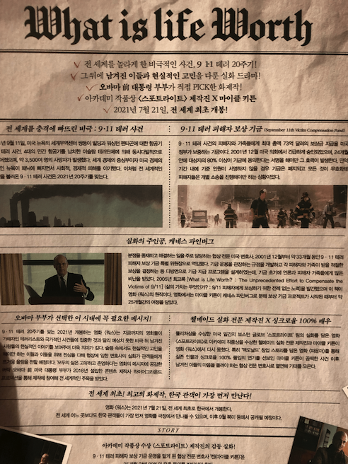 영화 워스는 나의 작은 시인에게를 연출한 사라 콜란겔로의 연출작입니다. 영화는 911 테러 이후 피해자 및 유족자들에게 국가가 어떻게 보상을 할 것인지에 대해서 논의하는 과정을 담아내고 있습니다. 당시 쉽지 않을 것이라 예측되었던 국가와 유족과의 협상 프로젝트를 스스로 하겠다고 나선 협상 전문 변호사 케네스 파인버그의 이야기도 함께 담겨 있으며 일명 켄이라 불리는 그가 어떻게 유족과 극적인 협상을 이루어냈는지에 대한 과정을 전개합니다.