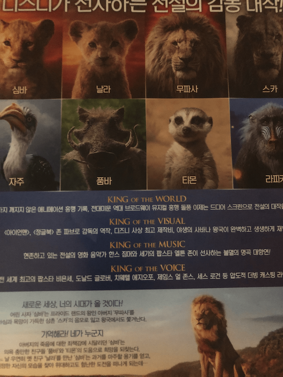 그리고 조조로 라이온 킹을 관람한 제 의견 또한 장점보다는 단점이 더 많을 것 같습니다. 물론 흥행의 여부로만 따진다면 분명 라이온 킹은 알라딘을 이어 흥행가도를 이어갈 듯 하지만 그것과는 상관없이 이 영화는 겉만 화려한 영화입니다. 차라리 원작의 애니메이션 영화를 다시 보는 것이 나을 정도로 이번 영화는 원작을 뛰어넘지도, 따라가지도 못하고 있습니다.
